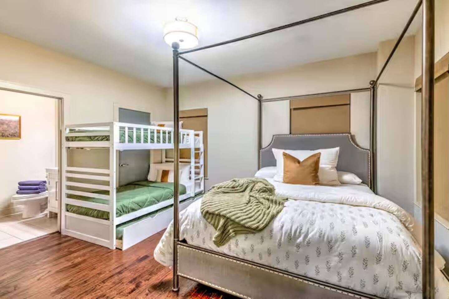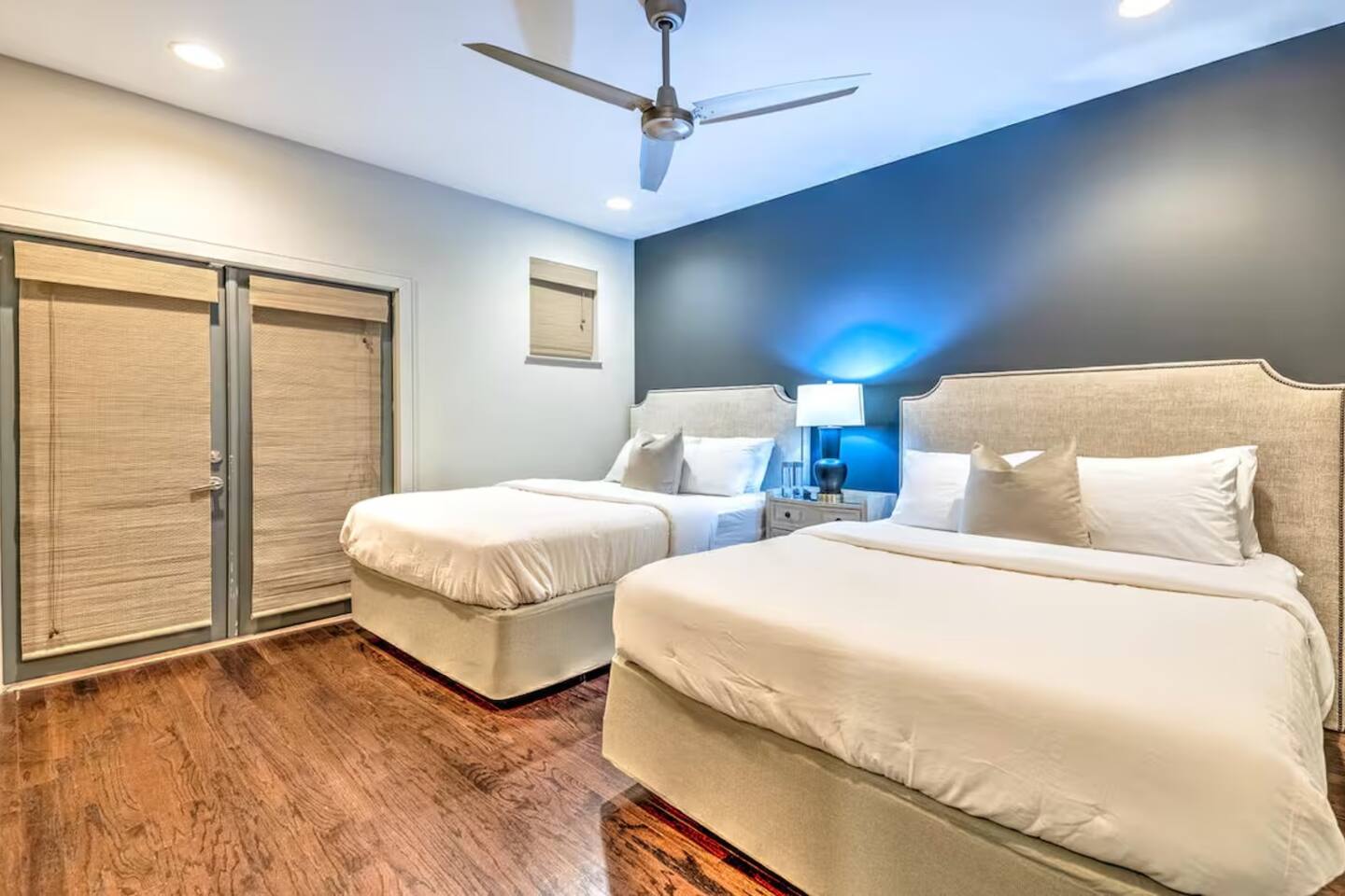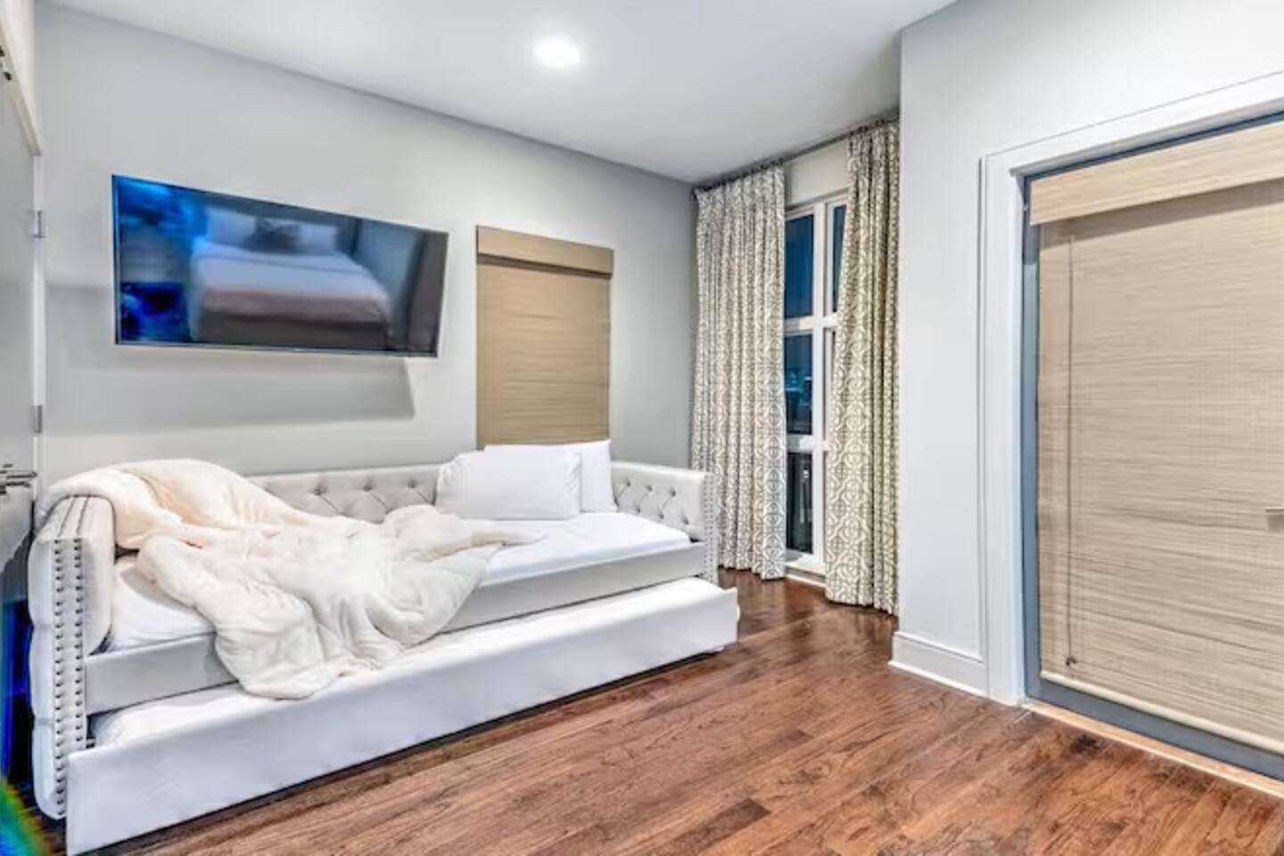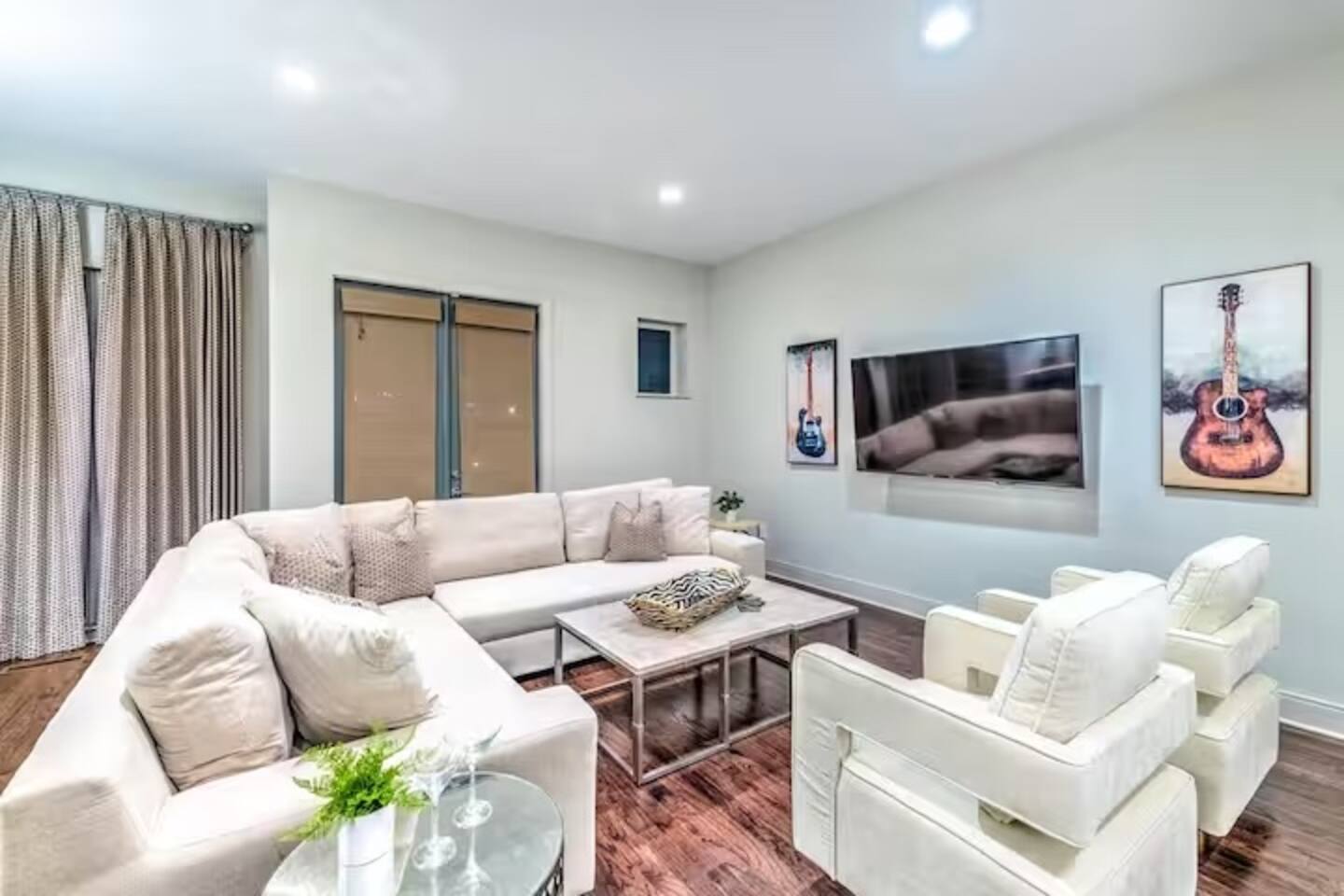 Property Type: Entire home Bedrooms: 4 Bathrooms: 4 full Beds: 13 (1 king, 1 queen, 2 queens, 4 singles, 3 singles — across 4 bedrooms) Max Guests: 12 Parking: Private 2-car garage, included Check-in: 4:00 PM (keyless/access code) Checkout: 11:00 AM Floor: Multi-level home with rooftop terrace Outdoor Space: Private rooftop terrace with skyline views Laundry: In-unit washer Kitchen: Fully equipped Location: Steps from the Gulch, Nashville, TN Wifi: Yes TV: Yes