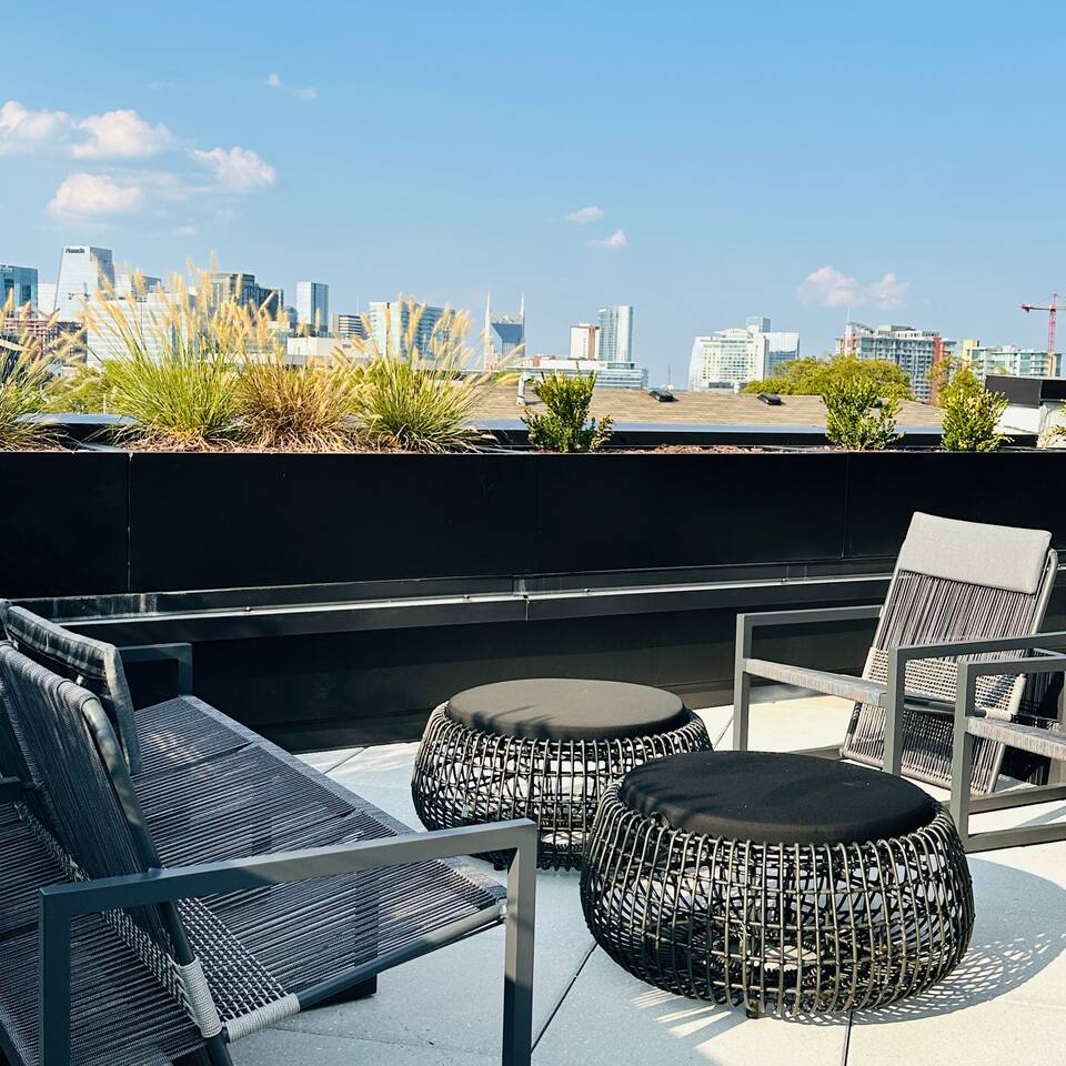Brand-new building in the heart of Nashville’s Music Row, designed for short-term vacation rentals. The 5th floor offers fantastic amenities, including a gym, conference room, and plenty of indoor and outdoor lounge areas to switch up your scenery. The pool, open April through October, catches beautiful morning sun. Enjoy free parking in a private garage, and secure, keyless entry throughout the building. Nearby, you'll find some of Nashville's best dining spots, with The Wellhouse Coffee shop just around the corner—perfect for starting your day. Staying here places you right at the center of Nashville’s most vibrant neighborhoods.